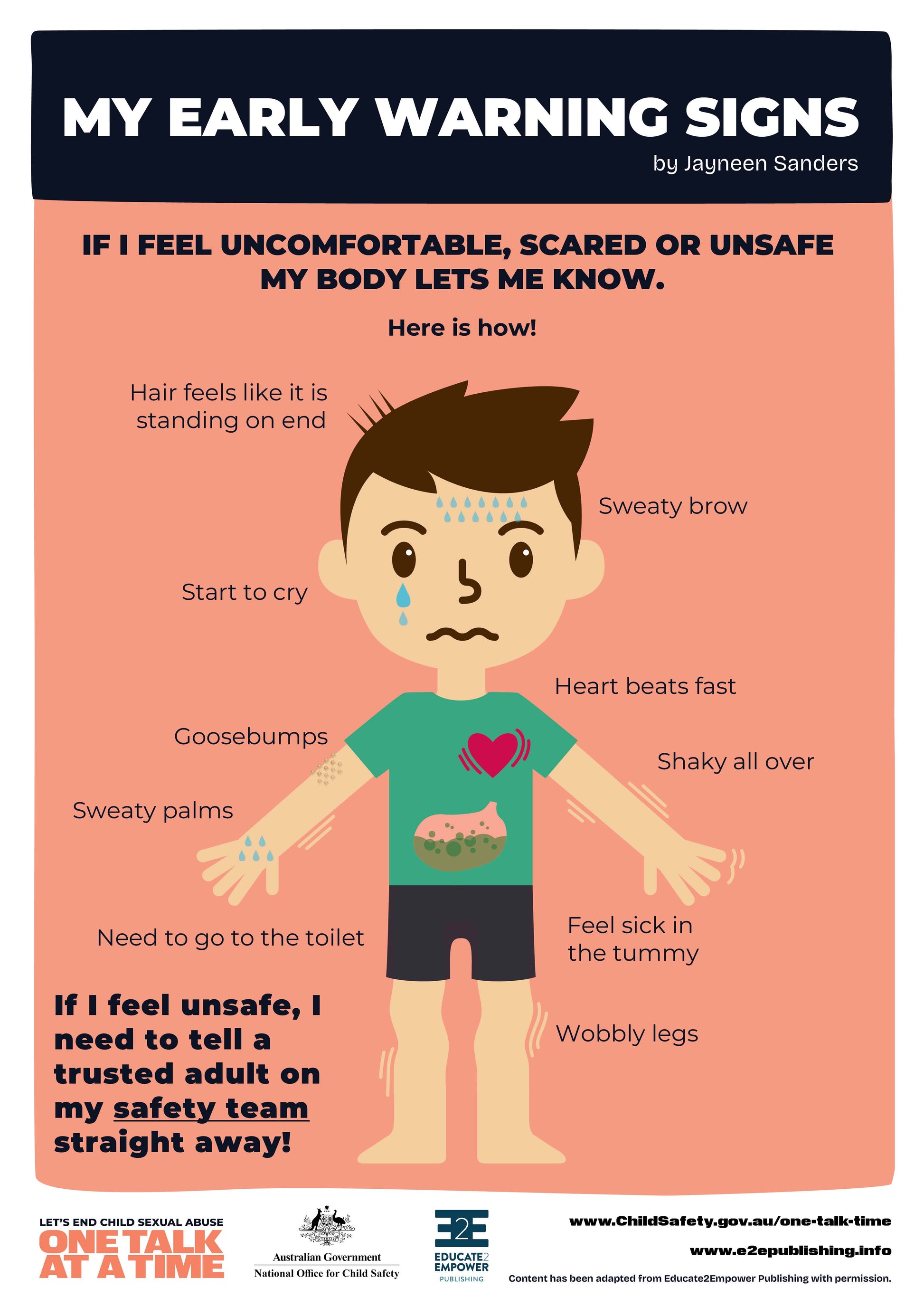 This Free Poster made in collaboration with the National Office for Child Safety to help children recognise how their body lets them know they feel unsafe. The My Early Warning Signs poster provides clear understandable examples of the bodies physiological reactions to unsafe situations.